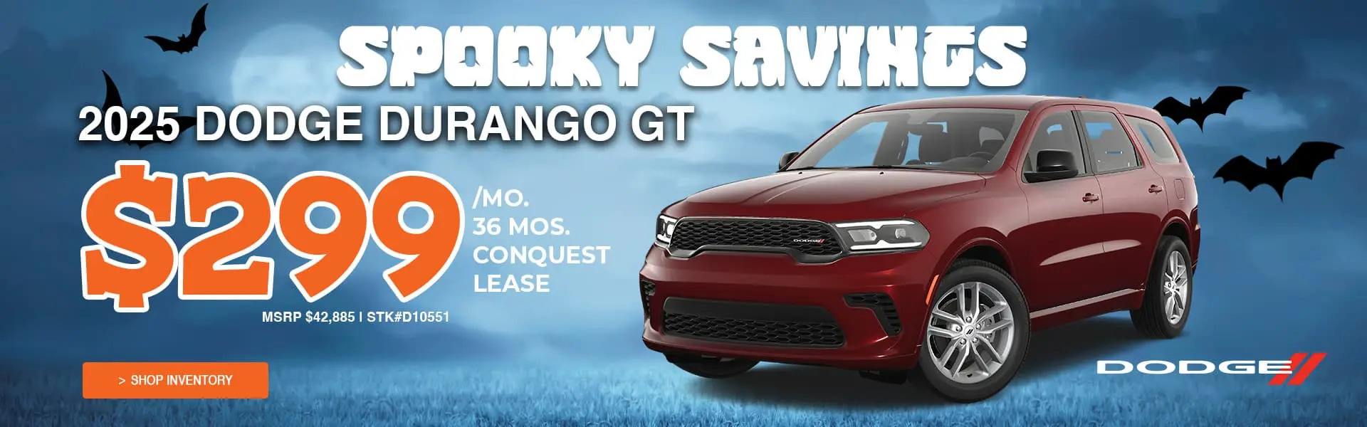 Lease 2025 Dodge Durango GT, Conquest Lease for $299 per month for 36 Months, MSRP $42,885 | STK#D10551. 10% down payment, 5,000 miles per year. All offers subject to credit approval to very well-qualified buyers. Approval based thru SFS financing. Excludes tax, title, and doc fee. Photo for illustration purposes only. Offer ends 11/3/2025.