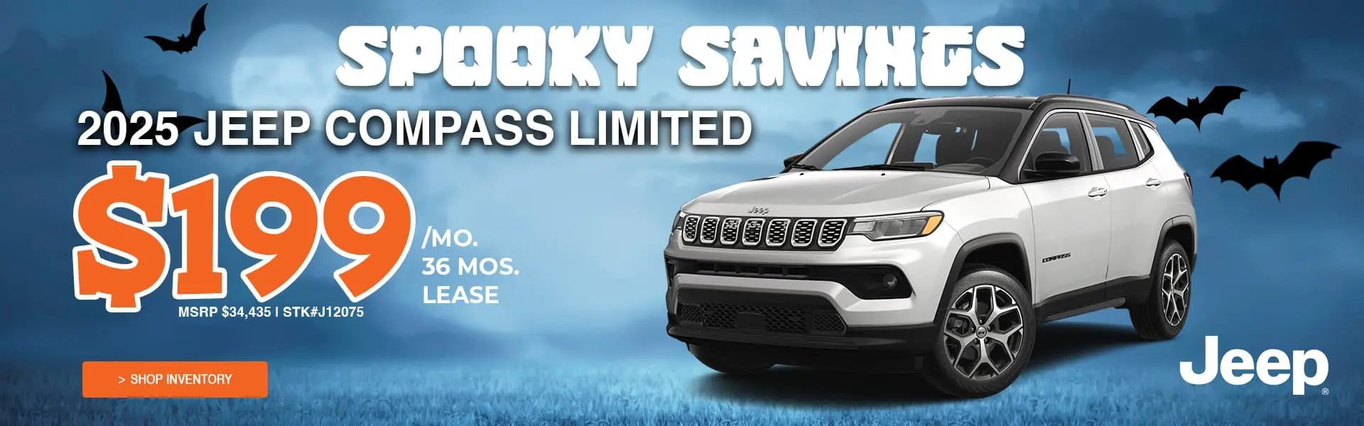 Lease 2025 Jeep Compass Limited $199 per month for 36 months , MSRP $34,435 | STK#J12075. 10% down payment, 5,000 miles per year. All offers subject to credit approval to very well-qualified buyers. Approval based thru SFS financing. Excludes tax, title, and doc fee. Photo for illustration purposes only. Offer ends 11/3/2025.