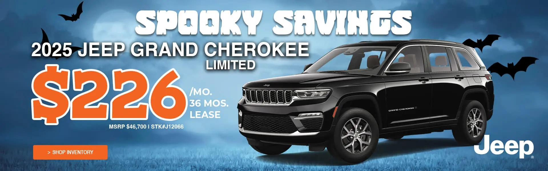Lease 2025 Jeep Grand Cherokee Limited 4x4 $226 per month for 36 months OR Savings up to $11,000 OFF or 4.9% at 72 months MSRP $46,700 | STK#J12066. 10% down payment, 5,000 miles per year. All offers subject to credit approval to very well-qualified buyers. Approval based thru SFS financing. Excludes tax, title, and doc fee. Photo for illustration purposes only. Offer ends 11/3/2025.