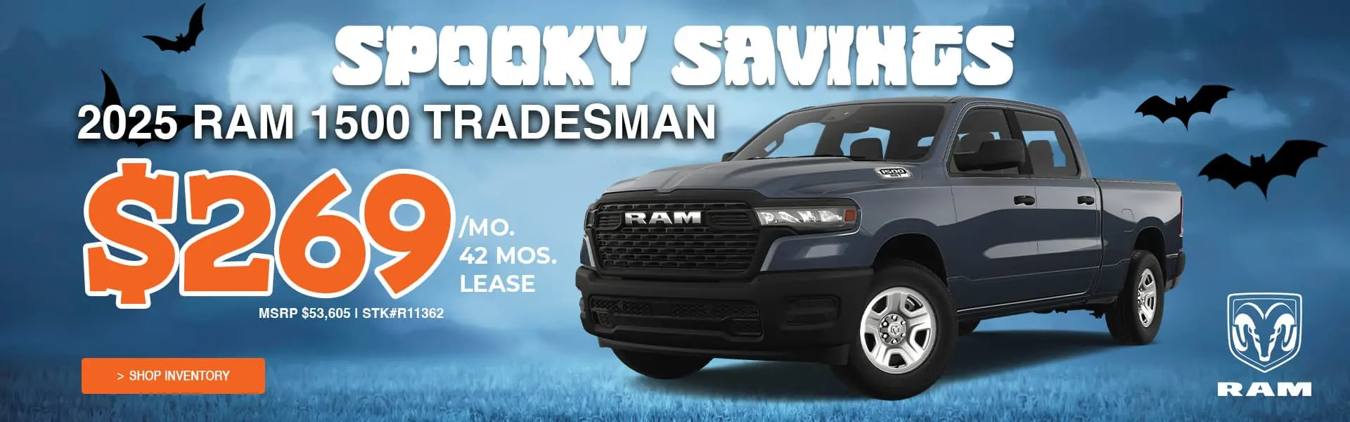 Lease 2025 RAM 1500 Tradesman 4x4 $269 per month for 42 months OR Conquest Savings over $10,000 WITH 3.9% at 72 OR 0% for 72 months (Including Big Horn/ Retail). MSRP $53,605 | STK#R11362. 10% down payment, 5,000 miles per year. All offers subject to credit approval to very well-qualified buyers. Approval based thru SFS financing. Excludes tax, title, and doc fee. Photo for illustration purposes only. Offer ends 11/3/2025.